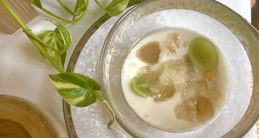 栄養満タンな飲む点滴「甘酒」を主役に、豆乳と合わせたポタージュに、秋を感じるぶどうをコンポートにして、白ワインのジュレとシャインマスカットを浮かべました。